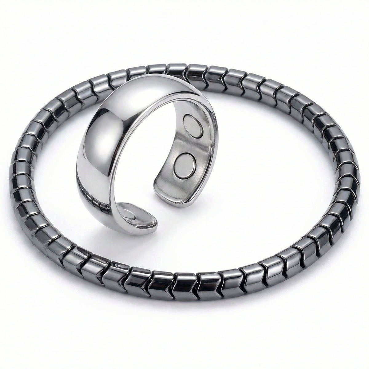 Discrete magnetic elements built into the inner band. Designed for those who prefer wellness-inspired accessories.