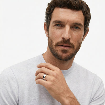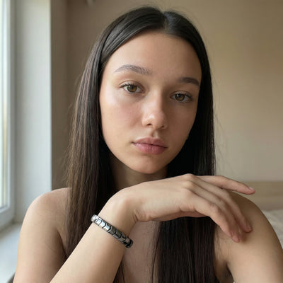 The Magnetic Hematite Bracelet combines minimalist design with integrated magnetic elements seamlessly built into the inner band.