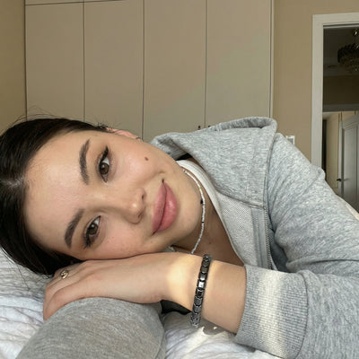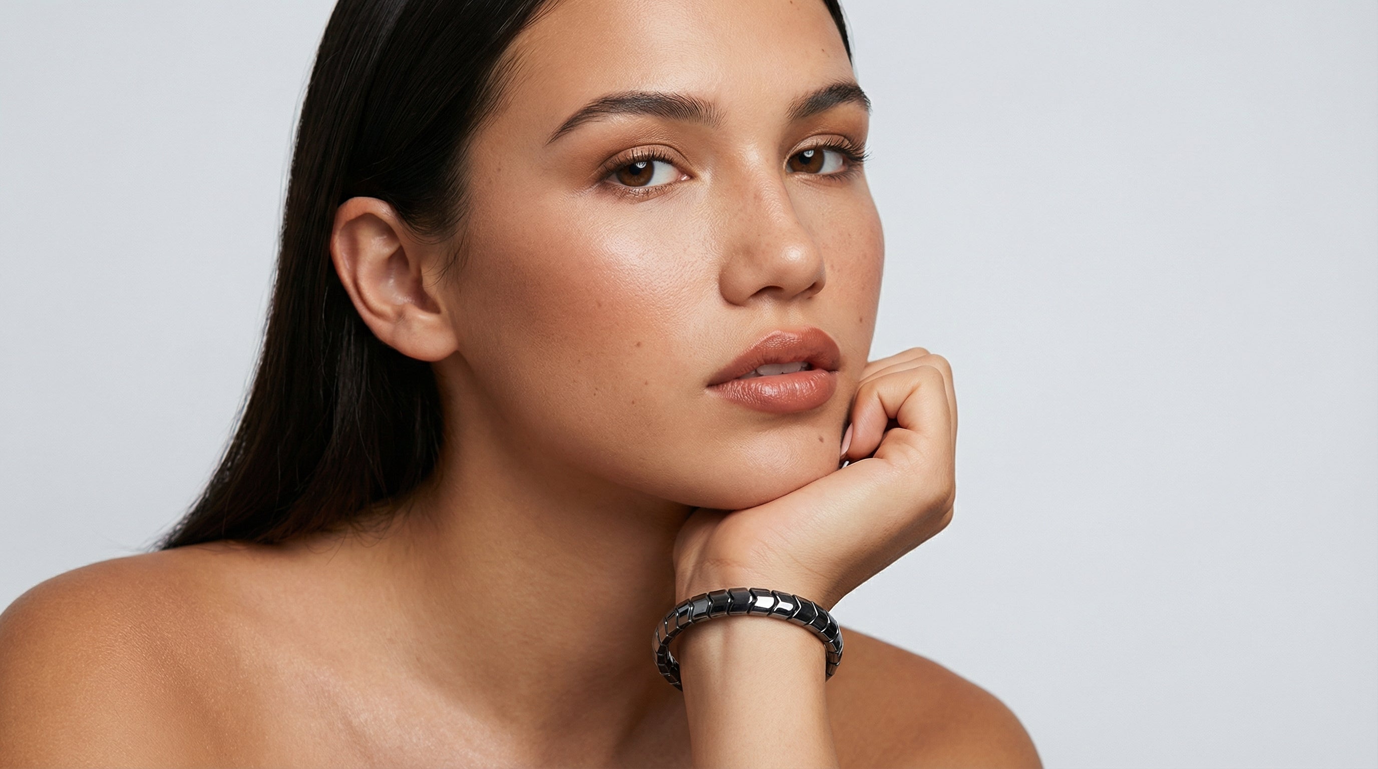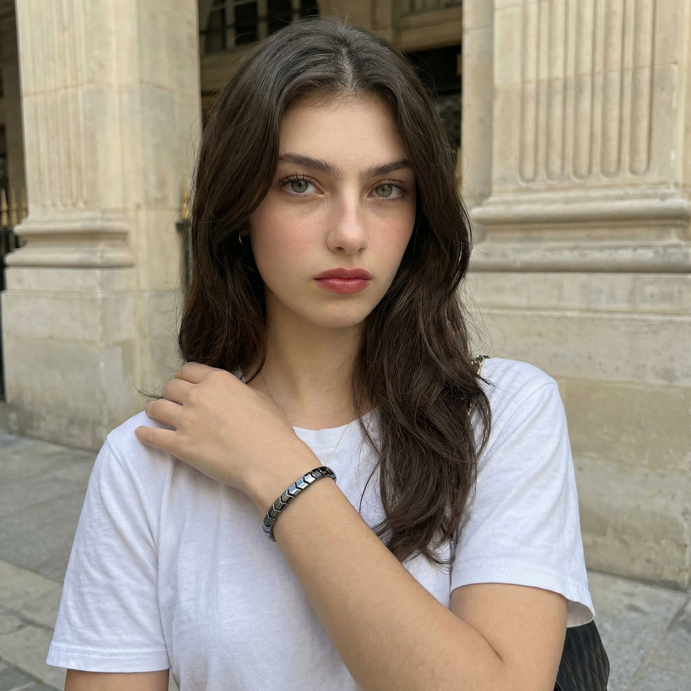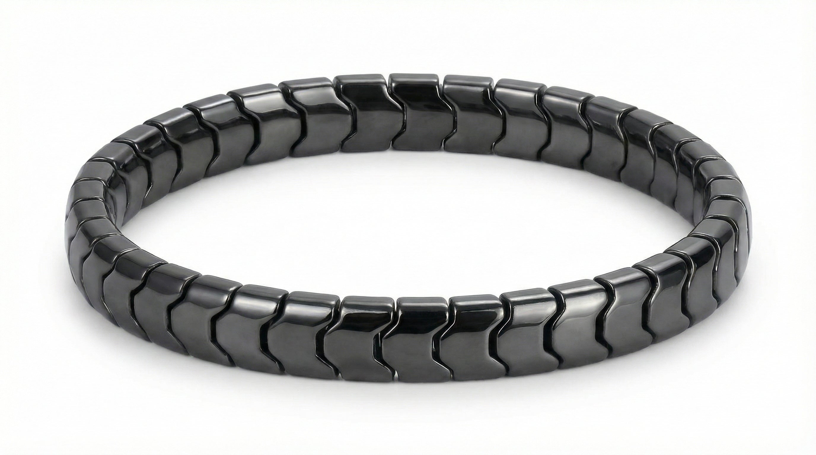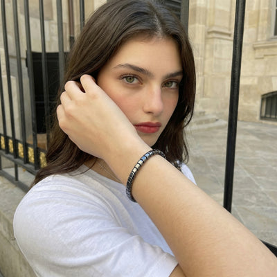 As the bracelet rests naturally against the wrist, discreet magnets maintain continuous contact throughout the day. The polished hematite beads create a smooth, structured silhouette, while the flexible construction ensures comfortable, effortless wear.